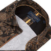 eaturing an exquisite stencil pattern of flowers and leaves, delicately outlined in tan, beige and gold against a rich black background,