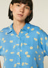 Oversized cropped blouse with floral primrose print. Shirt collar and short sleeves. Front buttons. Model wears size S.