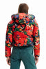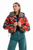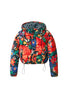 Cropped floral print puffer jacket with hood and adjustable draw string waist. Made with recycled fibres.