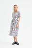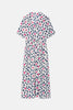 Heart print midi shirt dress. Shirt collar and short sleeves. Front buttons and belt.