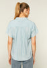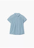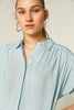 Blue blouse. Shirt collar and short dropped sleeves. Front buttons. Gathered detail. Model wears size S.