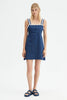 Blue mini light cotton dress. Square neckline and wide straps. Fitted bustline detail. Invisible side zip fastening. Zig-zag detailing. Model is 178 cm tall and wears size S.