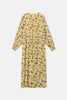 Green floral print midi dress. Round neckline and long puffed sleeves finished with smocking. Back closure with opening and button. Detail of horizontal cuts.