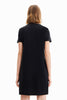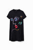 A short, loose-fitting T-shirt dress with short sleeves and an arty face print on the front.