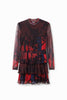 A fitted short dress with long sleeves, printed tulle and an A-line skirt with ruffle-effect pleated layers. Designed by M. Christian Lacroix.