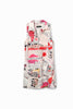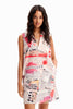 A short sleeveless dress with a polo-style neck, rear seam, stretch fabric and newspaper clipping print.