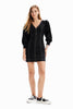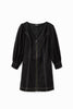 A short fitted dress with 3/4 puff sleeves, a front zip, V-neck and contrasting seams.