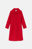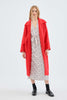 Red midi coat with lapel collar and long sleeves. Front closure with buttons and side pockets.