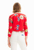 A short, long-sleeve blouse with adjustable gathering, elasticated hem and an opening on the back. Featuring a floral print.
